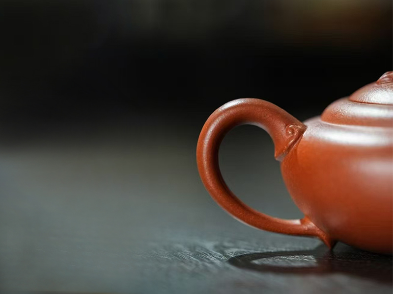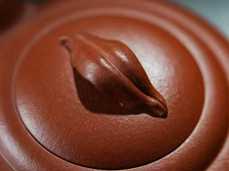 壶钮独创写实树叶造型,两瓣式曲面精准还原秋叶经络走向,叶脉堆塑,细若游丝却遒劲有力,卷曲的形态、还原的结构,写实而富以生机,将实用主义与写意美学平衡得恰到好处、恰如其分。