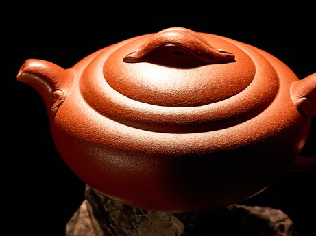 精选纯红降坡泥,经十年陈腐养土,泥色明亮沁透幽光,视之醒目,叩之清脆。烧成后,呈现出独特的细腻质感,宛若夜幕下悬立于天际的“玉盘”,在光影流转间,尽显深邃意境。